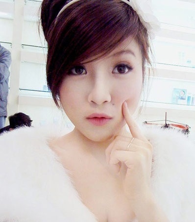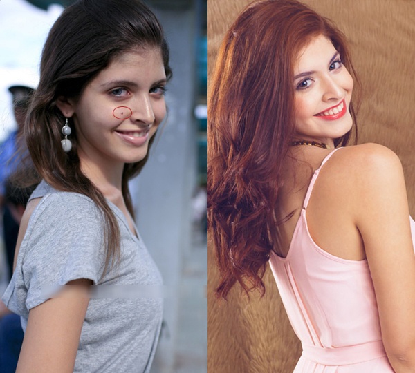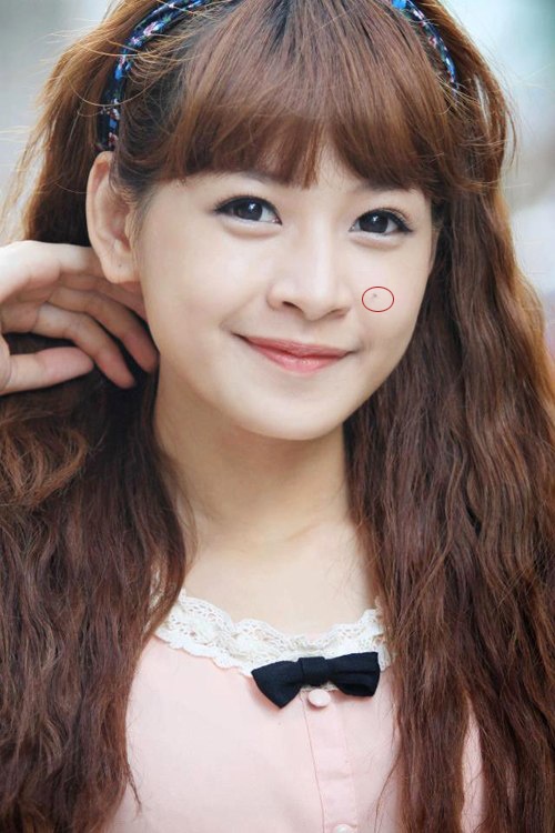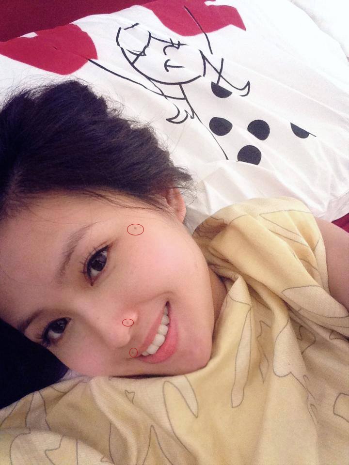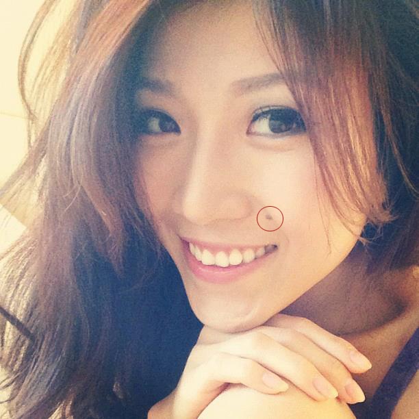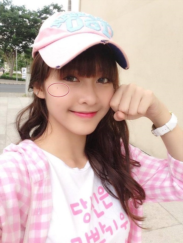 | Chấm nhỏ này vẫn hiện rất rõ trên má dù hot girl đã trang điểm. |