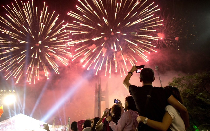 | Cặp đôi ôm nhau ngắm pháo hoa giao thừa ở thủ đô in Manila, Philippines. Ảnh: AFP |
