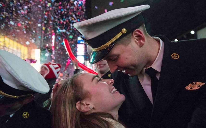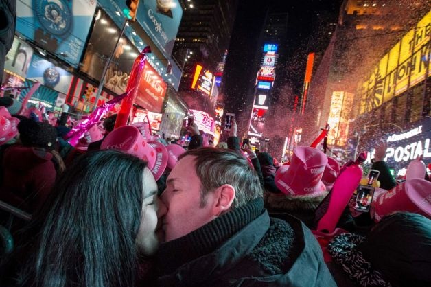 | Khi đồng hồ vừa điểm tiếng chuông giao thừa, đánh dấu khoảnh khắc bắt đầu năm mới 2015 tại thành phố New York, Mỹ, các cặp đôi trao nhau những nụ hôn nồng ấm. Ảnh: Reuters |