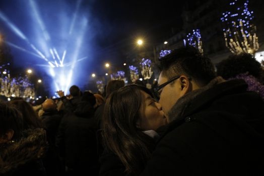 Nụ hôn ngọt ngào trên đại lộ Champs Elysees ở thủ đô Paris, Pháp, khi năm mới 2015 vừa sang. Ảnh: Getty