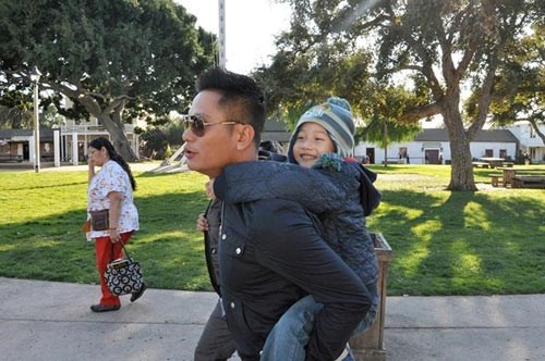 | Hình ảnh Đức Hải cõng bé Bảo Nam từng gây xúc động, anh và con trai của vợ hết sức thân thiết với nhau. |