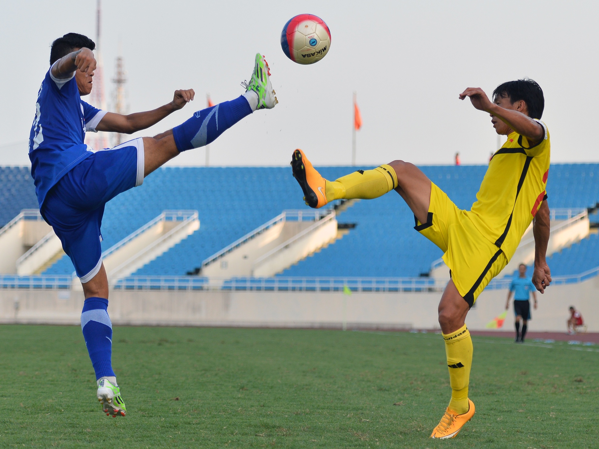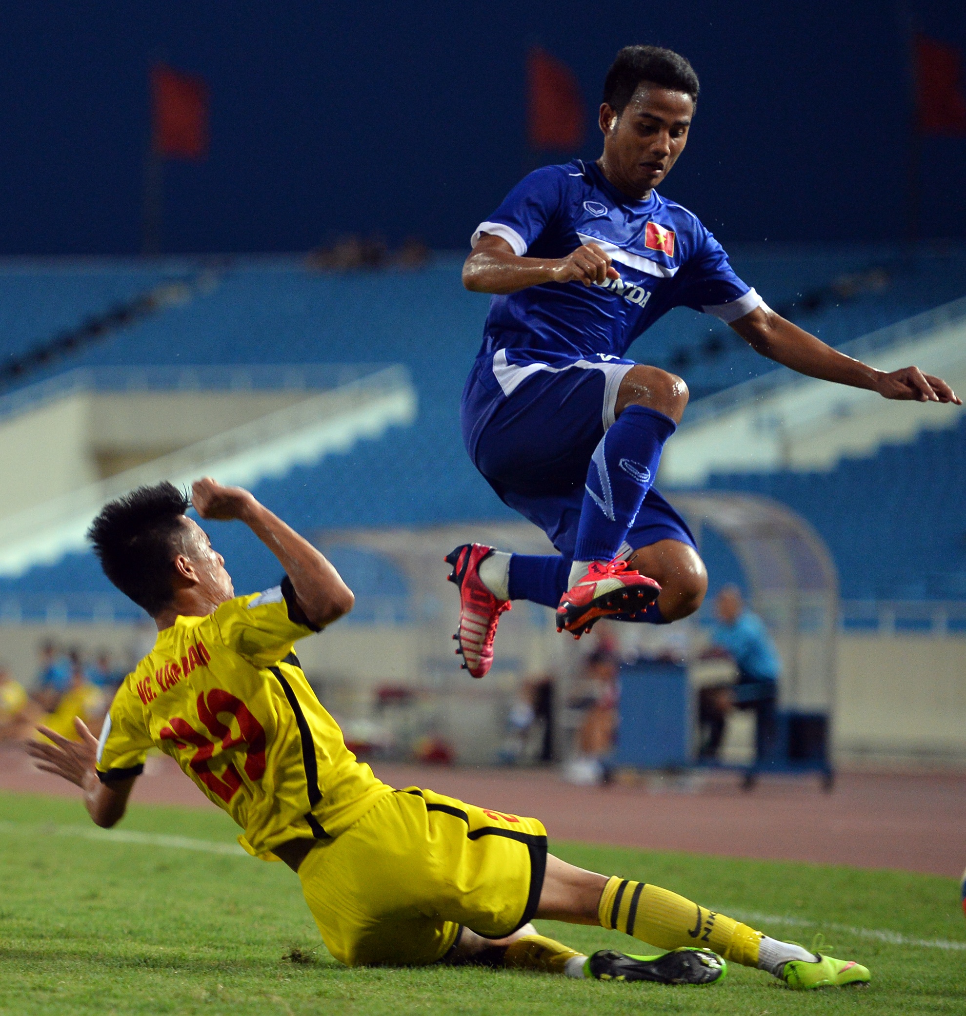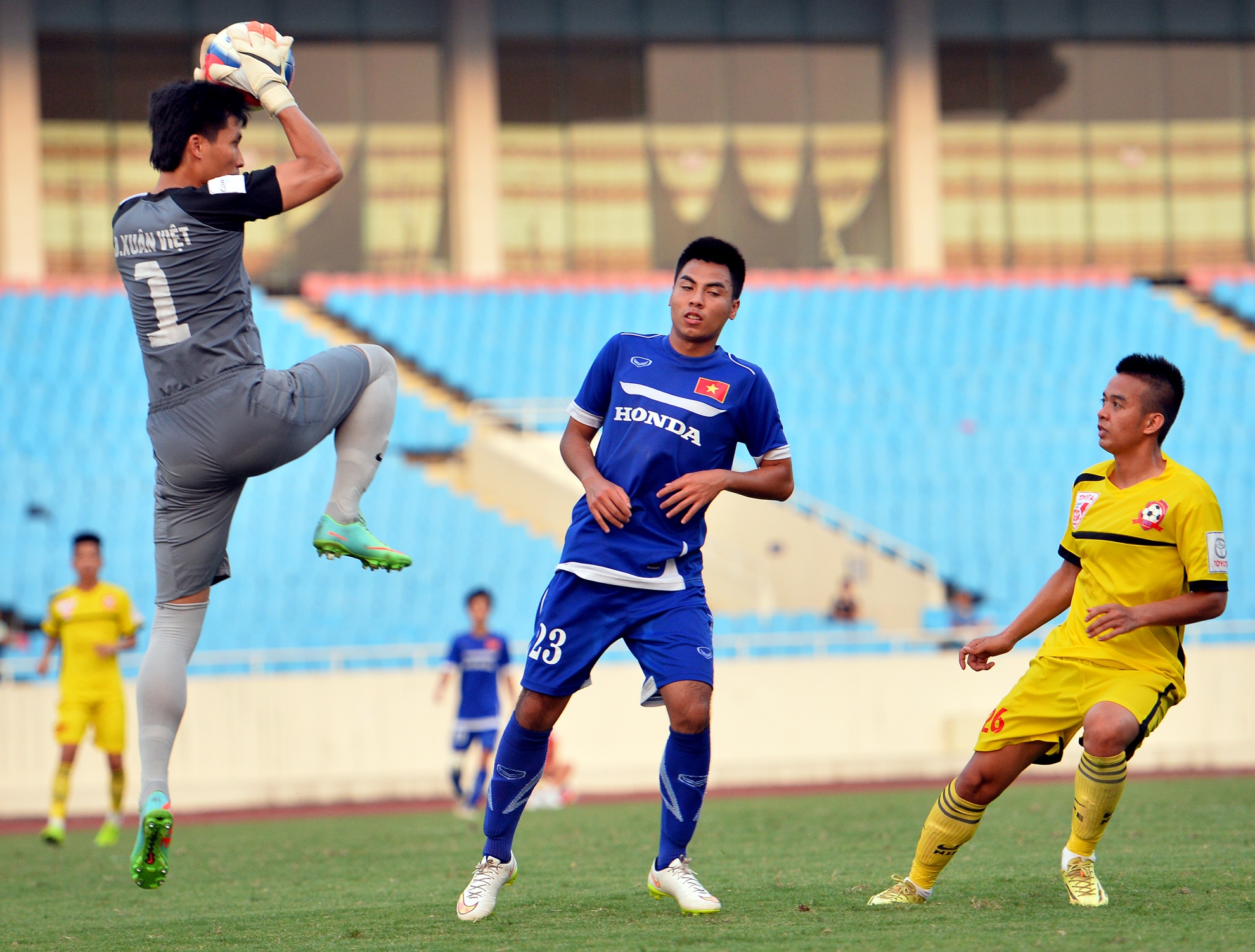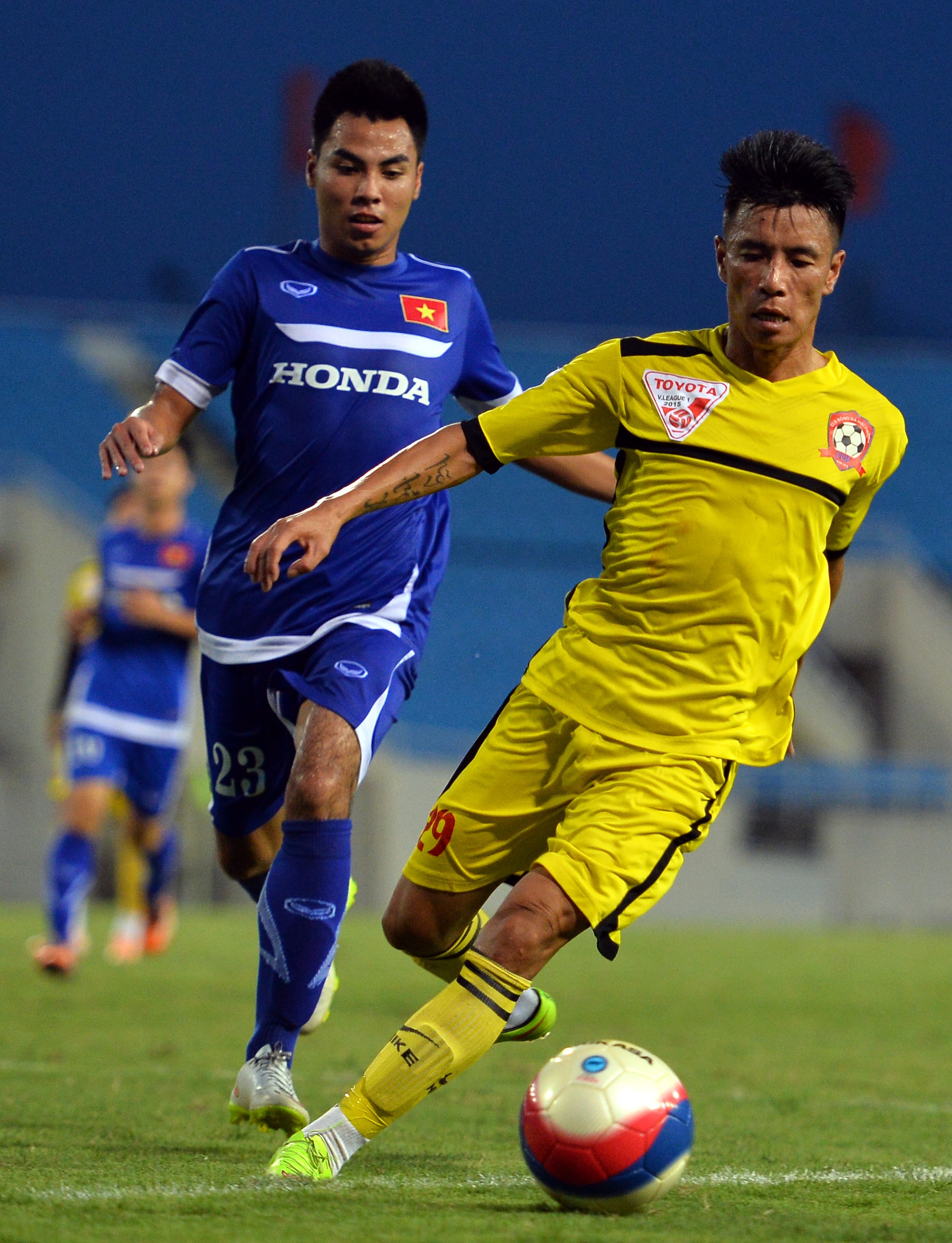 | Các học trò của HLV Miura cầm bóng nhiều hơn nhưng các pha ban bật ở hàng công chưa được nhuần nhuyễn nên đã gặp nhiều khó khăn trong việc tìm đường tiếp cận khung thành của thủ môn Xuân Việt. |