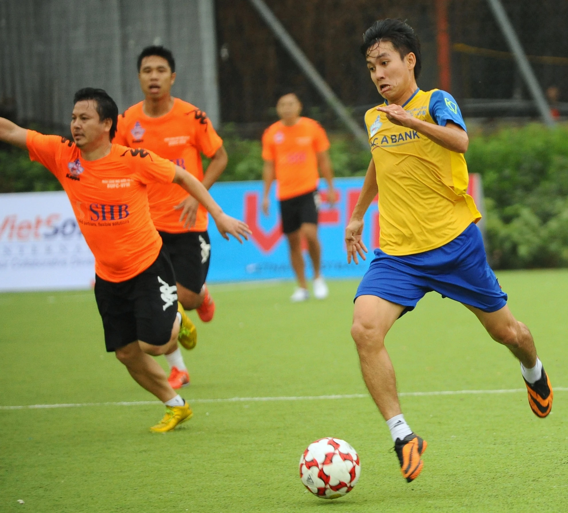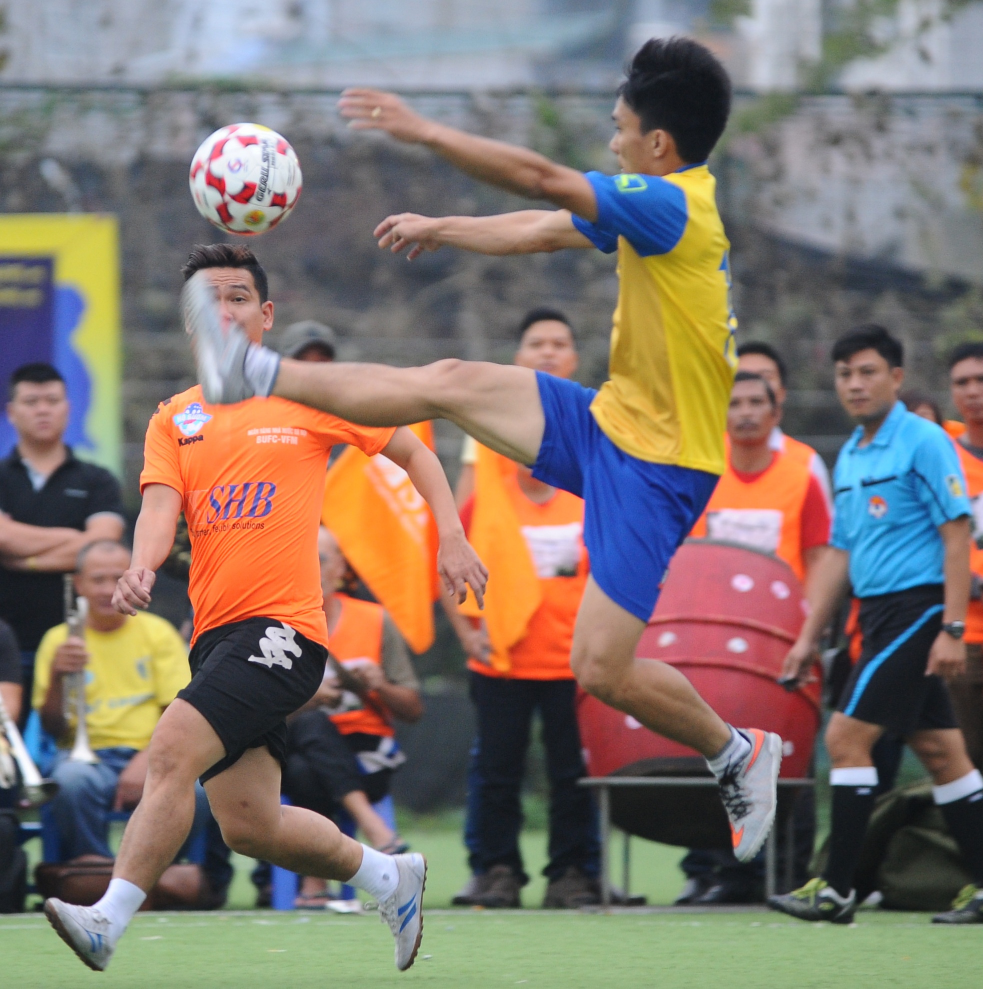 | Một pha tranh bóng thể hiện sự quyết tâm của giải "phủi" liên ngân hàng. |
