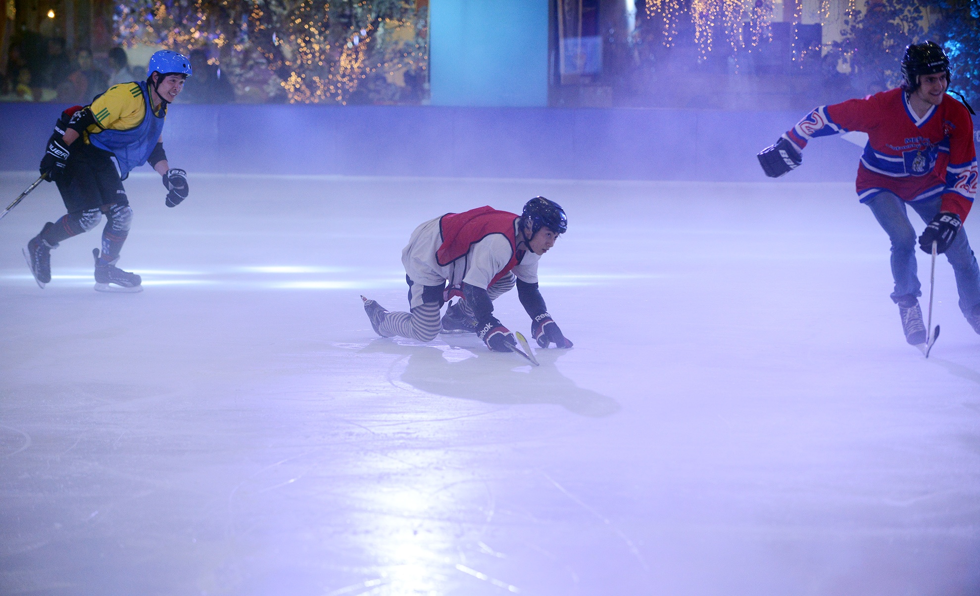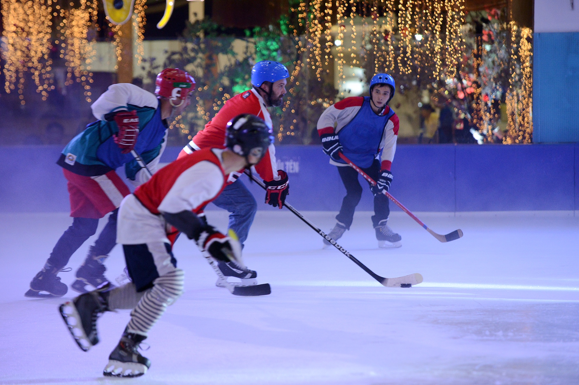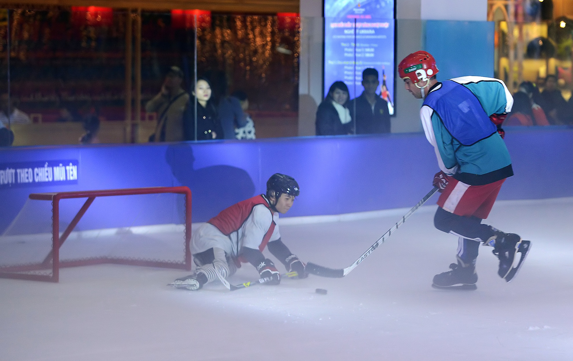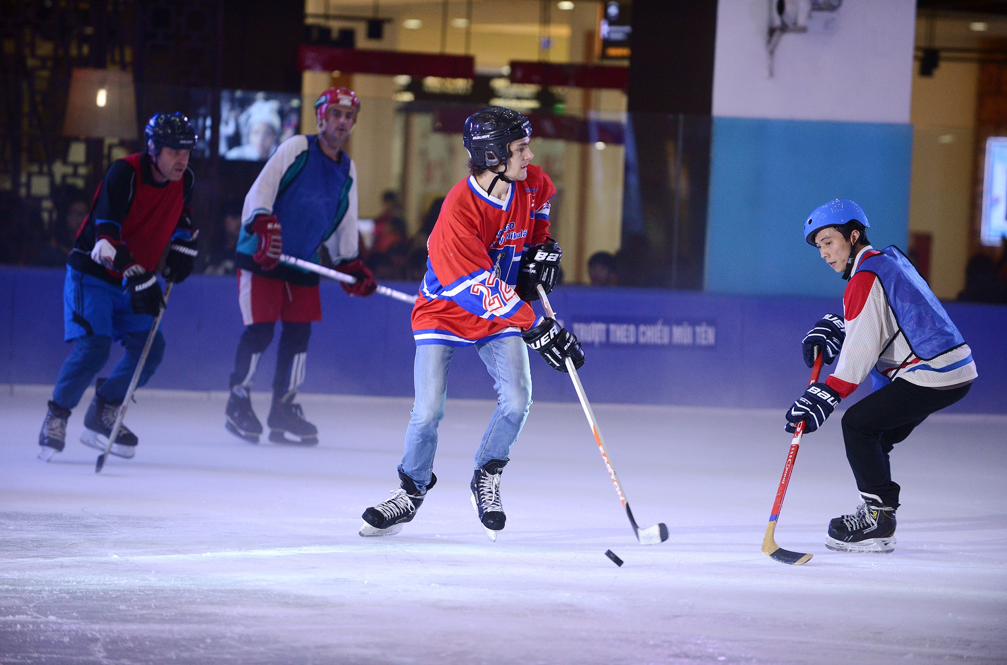 | Tại khu vực sân trượt băng của trung tâm thương mại dưới lòng đất Royal City (Hà Nội), bộ môn thể thao Khúc côn cầu lần đầu tiên được biểu diễn. |
