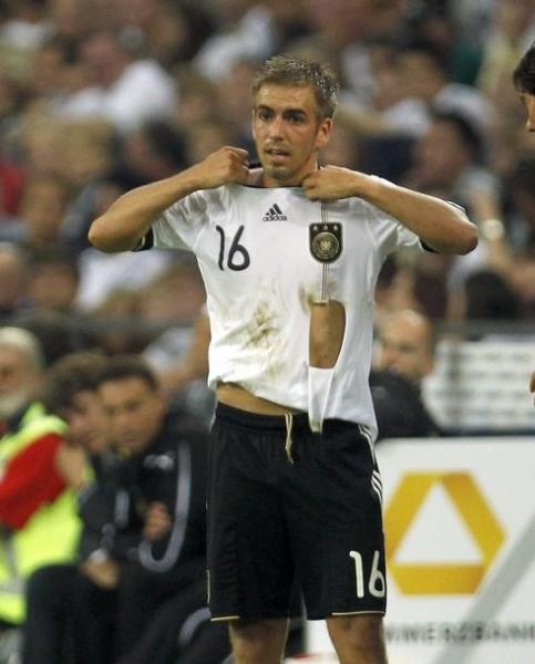Đội trưởng Philipp Lahm lúng túng với chiếc áo lấm lem, rách rưới trong trận Đức đánh bại Áo với kết quả 6-2 vòng loại giải vô địch châu Âu năm 2011.