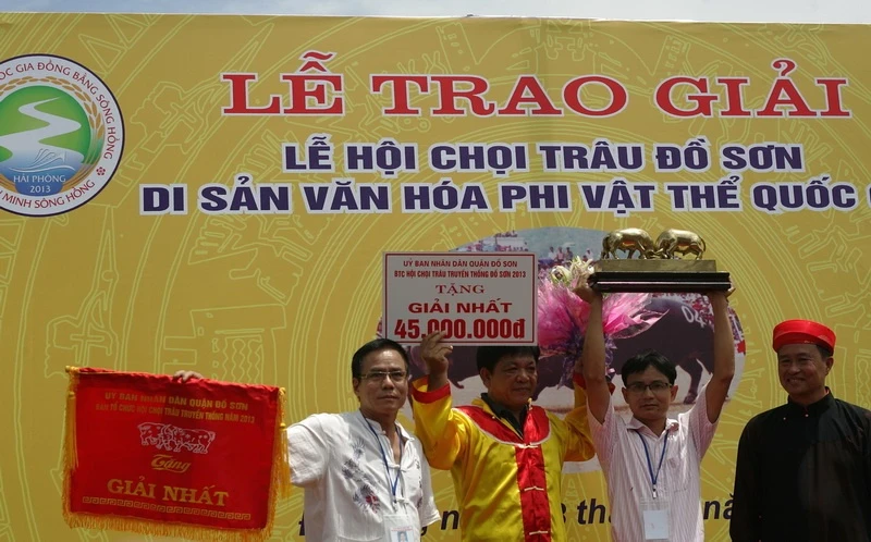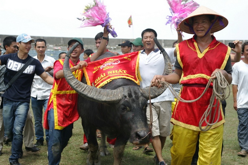 | "Ông trâu" số 24 đã là 'nhà' vô địch tại Lễ hội chọi trâu Đồ Sơn năm 2013. Trâu có nguồn gốc tại đồng bằng Sông Cửu Long, đặc điểm trâu có 2 khoang, 4 khoáy, mắt đỏ, sừng song kiếm. Khán giả tràn xuống sân bất chấp nguy hiểm để được tận tay chạm vào "ông trâu" |
