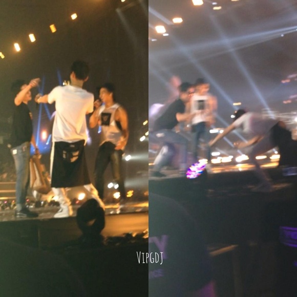 Thành viên điển trai của nhóm SHINee bị trượt chân và ngã về phía sau trong một tiết mục trên sân khấu Let’s Start Sharing Concert, tuy nhiên anh chàng rất nhanh chóng đứng dậy và giữ nguyên phong độ trong phần trình diễn còn lại.