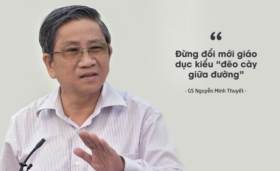 Tháng 4/2014, bàn về quyết định triển khai chương trình SGK năm 2018, cấm thi vào lớp 6, GS Nguyễn Minh Thuyết cho rằng, không thể đổi mới giáo dục bằng những quyết định chữa cháy vụn vặt và vội vàng, mà phải có tư duy chiến lược. Điều này giúp chúng ta tránh được những quyết định chạy theo dư luận, theo kiểu “đẽo cày giữa đường”. Xem chi tiết. |
