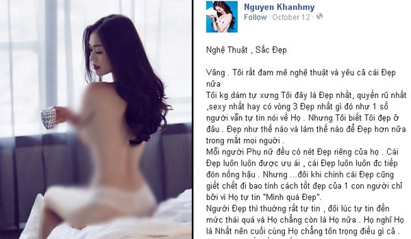 | Phía sau sàn catwalk của giới mẫu Việt khá phức tạp, có không ít những màn đá xéo nhau giữa các chân dài. Hôm 12/10, người đẹp Mỹ nhân Sài thành đăng tải dòng trạng thái dài với tiêu đề “Nghệ thuật, Sắc đẹp”. Trong đó cô trích dẫn những lời tuyên bố tự tin về nhan sắc của một số người đẹp khiến nhiều người đoán rằng cô đang ám chỉ Ngọc Trinh. |