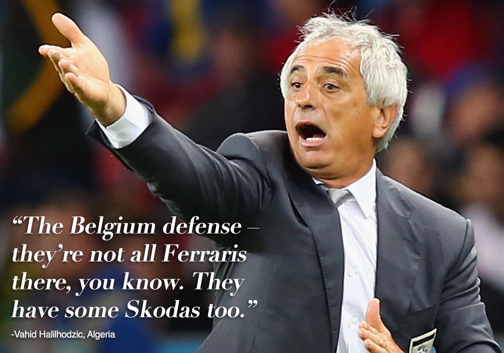 "Bạn biết đấy, đâu phải ai trong hàng thủ của Bỉ cũng là những chiếc Ferrari. Họ cũng có vài chiếc Skodas chứ", HLV Algeria - Vahid Halilhodzic nhận xét về hàng thủ của đội tuyển Bỉ.