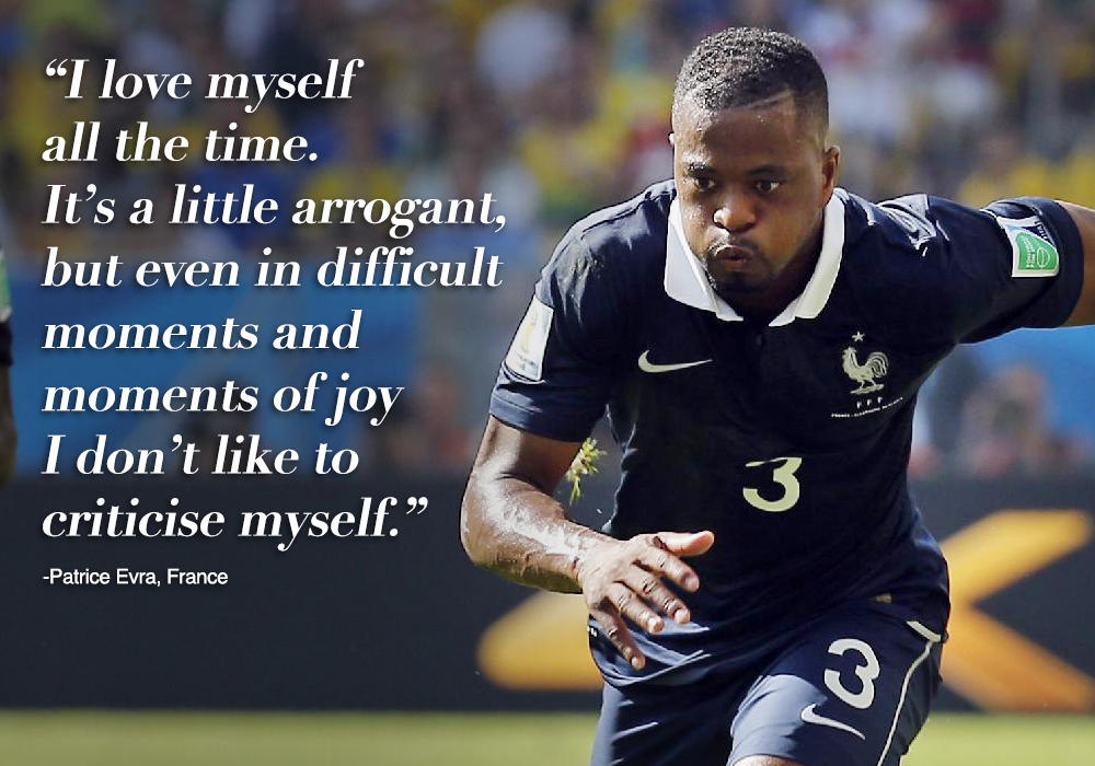 "Lúc nào tôi cũng yêu bản thân. Dù có hơi kiêu ngạo nhưng dù khó khăn hay vui vẻ, tôi chẳng bao giờ chỉ trích bản thân" - Patrice Evra của Pháp nói.