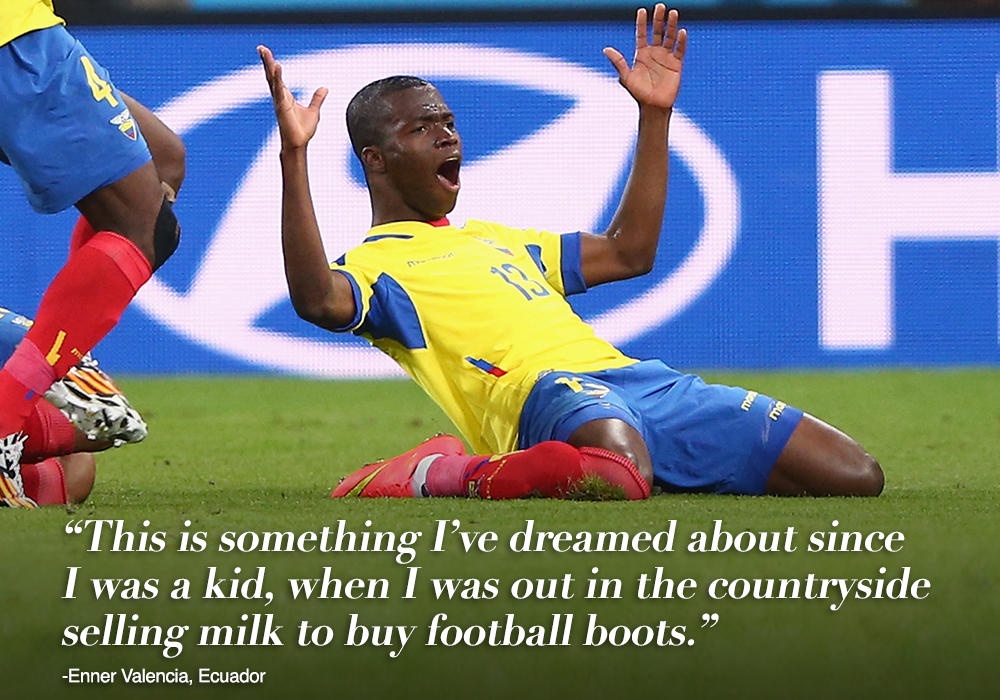 "Đây là những gì tôi từng mơ từ nhỏ, khi tôi còn phải lang thang tới các vùng quê bán sữa để lấy tiền mua những đôi giày đá bóng" - Enner Valencia (Ecuador) vỡ òa hạnh phúc khi nói về World Cup.