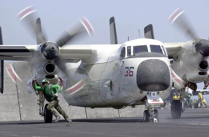 Máy bay vận tải C-2 Greyhound là một trong những cầu nối quan trọng giữa các tàu sân bay với đất liền. Đảm trách nhiệm vụ chuyên chở hàng hóa quan trọng, cần tốc độ, những chiếc C-2 Greyhound luôn có mặt trên các tàu để hỗ trợ hậu cần cho nhóm tàu tấn công trong trường hợp cấp bách. Ngoài ra, C-2 Greyhound còn đảm trách nhiệm vụ chuyên chở nhân lực từ các căn cứ hải quân tới hàng không mẫu hạm và ngược lại. Ảnh: Wiki. |