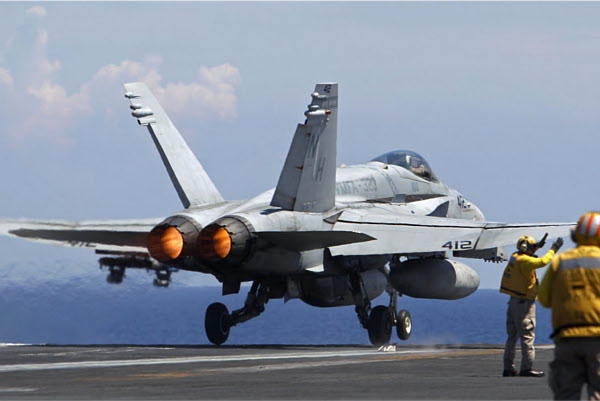 Phản lực chiến đấu F/A-18 Hornet, sản phẩm của tập đoàn chế tạo máy bay McDonnell Douglas, đảm trách vai trò tấn công chủ lực trên tàu sân bay USS Nimitz. F/A-18 Hornet là máy bay chuyên dụng trên hàng không mẫu hạm, có khả năng hoạt động trong mọi điều kiện thời tiết, bất kể ngày đêm. Được thiết kế để đảm trách nhiều nhiệm vụ ở vận tốc siêu âm, F/A-18 Hornet có khả năng tấn công mặt đất, tấn công trên không hoặc đánh chặn. Ảnh: Wiki. |