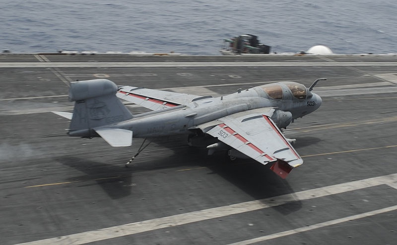 Bên cạnh các máy bay chuyên trách tấn công, USS Nimitz còn mang theo máy bay tác chiến điện tử EA-6B Prowler. Bắt đầu hoạt động từ năm 1971 tới nay, EA-6B Prowler đảm trách nhiệm vụ gây mù hệ thống radar đối phương, làm giảm đáng kể khả năng phòng không của đối thủ. Chúng còn có khả năng mang và bắn tên lửa chuyên dụng, nhằm vô hiệu hóa hệ thống điện tử của kẻ địch. Kíp phi công của EA-6B Prowler gồm 4 người, bao gồm 3 chuyên gia phụ trách chiến tranh điện tử. Ảnh: navair.navy.mil. |