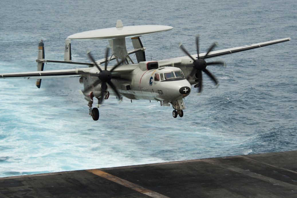 E-2 Hawkeye là máy bay cảnh báo sớm hoạt động trong mọi điều kiện thời tiết, có khả năng xuất kích từ tàu sân bay. Chiếc máy bay 2 động cơ cánh quạt này sở hữu hệ thống radar và thông tin liên lạc vượt trội nên có thể đảm nhận vai trò chỉ huy trên không. Tuy nhiên, E-2 Hawkeye hoàn toàn không có khả năng mang các loại vũ khí tấn công. Ảnh: Flickr. |