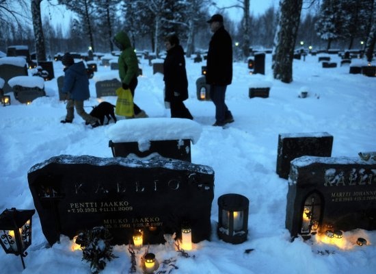 Trong đêm Giáng sinh, người Phần Lan thường thắp nến trên phần mộ của người thân. Truyền thống này bắt đầu từ thời tiền Ki-tô giáo. Khi đó người Phần Lan cổ tin rằng ngày đông chí, vào cùng khoảng thời gian với ngày Giáng sinh, là khoảng thời gian linh hồn người chết trở về với trần thế. Vào ngày này, người ta thường đặt thức ăn trên bàn và các gia đình thường ngủ dưới sàn nhà để nhường chỗ cho người thân từ thế giới bên kia về nghỉ ngơi. Truyền thống thắp nến trên mộ càng phổ biến hơn sau những năm 20 của thế kỷ trước. Ảnh: Huffingtonpost.