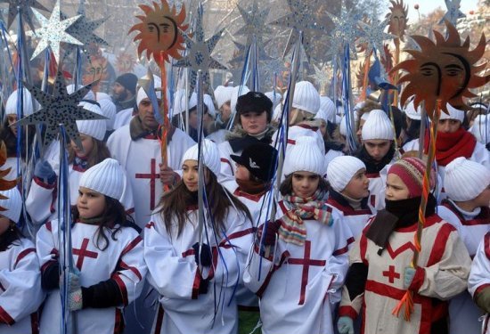 Tại Bulgaria, nhóm hát đồng ca Giáng sinh (koledari) sẽ đến các gia đình vào đêm 24/12. Thành viên của nhóm thường là các cậu bé. Mỗi người sẽ cầm một cây gậy đến nhà người thân, họ hàng hoặc hàng xóm để chúc sức khỏe, hạnh phúc và thịnh vượng. Một người đàn ông lớn tuổi dẫn đầu mỗi nhóm. Phong tục đón Giáng sinh tại Macedonia cũng tương tự ở ở Bulgaria nhưng diễn ra vào sáng ngày 6/1, tương đương với ngày trước thềm Giáng sinh trong lịch cổ Julian mà các nhà thờ theo dòng chính thống sử. Sau khi bài hát chúc phúc kết thúc, koledari sẽ được cho tiền, trái cây hoặc kẹo bánh. Ảnh: BGNES.