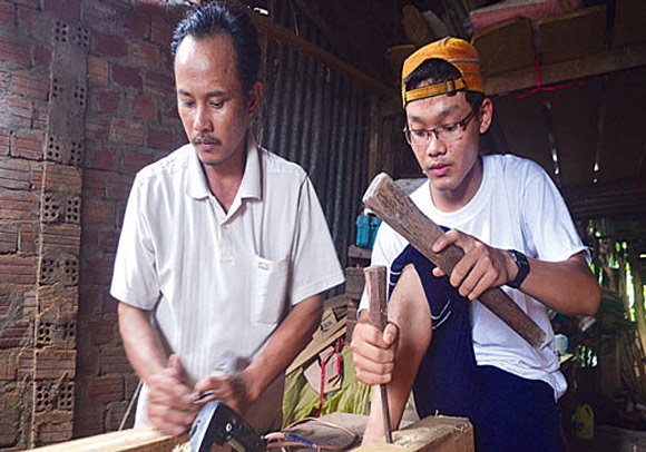 | Hai bố con Nguyễn Đức Hồng, Nguyễn Đức Thảo cùng làm thợ mộc (Ảnh Internet). |