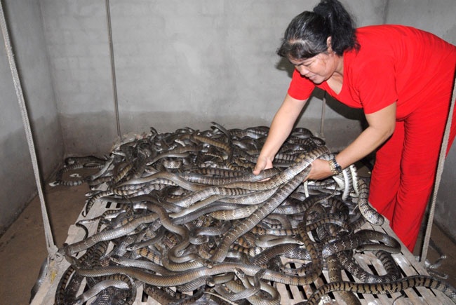 | Cũng giống chị Ngon, chị Ngôn ở huyện An Phú – An Giang thường hai tay trần cầm hàng chục con rắn hung giữ để biểu diễn cho khách xem trước khi ngã giá bán. |
