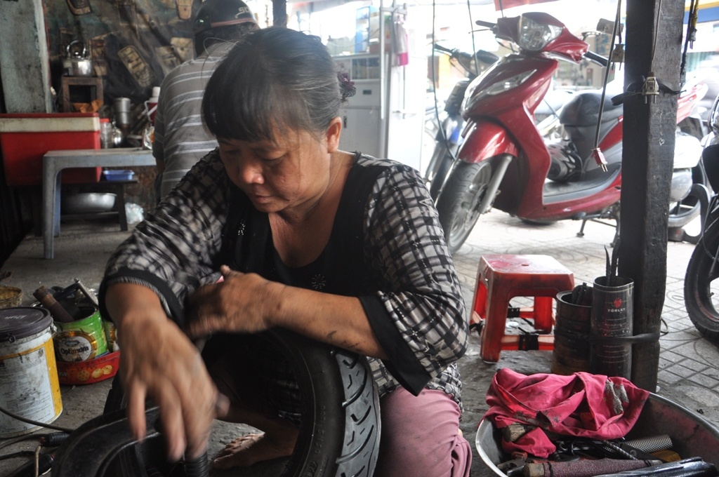 | Nói đến sửa xe mọi người thường nghĩ tới đó là công việc của đàn ông, nhưng tại Sài Gòn, không ít phụ nữ chọn cho mình cái nghề mưu sinh vất vả này. Trên 30 năm nay, những phụ nữ ở tiệm sửa xe đường Âu Cơ, quận Tân Bình vẫn miệt mài vá lốp xe máy, ô tô, xe tải. Ảnh: Trong các chị em, cô Ba là người có thâm niên nhất. Ở tuổi 60, cô có hơn 30 làm bạn với dầu nhớt. |