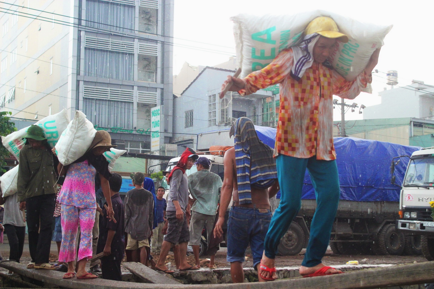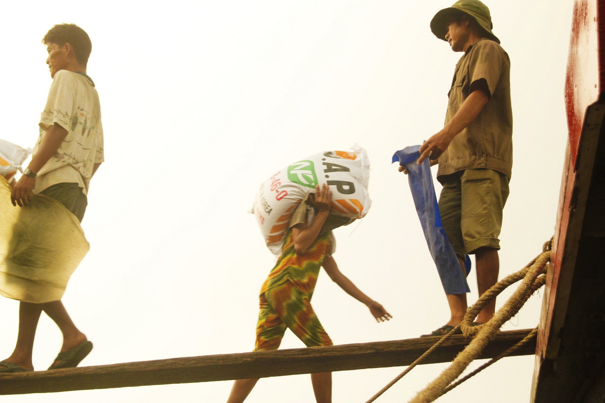 | Đôi tay họ ghì chặt lấy bao hàng 50kg trên lưng, đôi chân bám chặt lấy thanh gỗ được bắc từ mé kênh xuống mạn tàu để làm cầu. Không chỉ công việc bấp bênh, đồng lương còm cõi mà tai nạn có thể ập xuống với họ bất cứ lúc nào. Ảnh: Nguy hiểm luôn rình rập bởi sức nặng của bao hàng, khi họ phải chênh vênh bước trên những tấm ván cao có khi đến gần chục mét. |