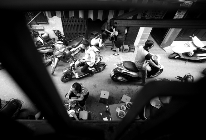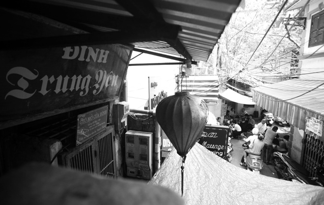 Tại phố cổ Hà Nội, hầu hết các ngõ nhỏ đều trở thành hàng quán khiến lối đi trở nên chật hẹp. Trong ảnh là một hàng ăn tại ngõ Trung Yên, quận Hoàn Kiếm, chiều ngang chỉ hơn 2m nhưng chật kín hàng quán kinh doanh và xe cộ.