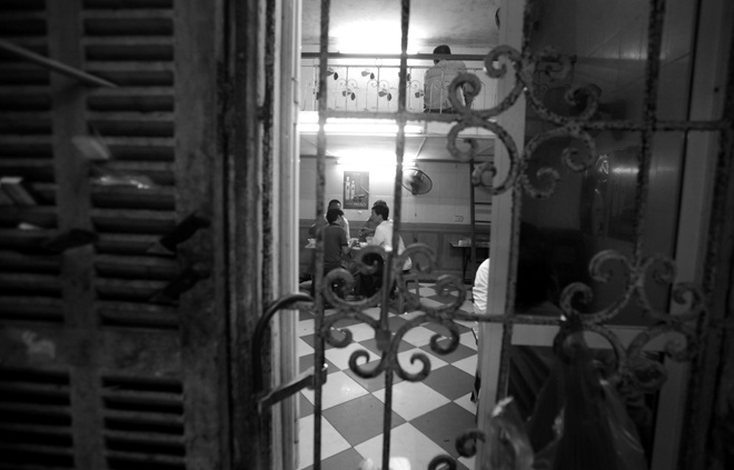 | 15h chiều nhưng quán nhỏ trong ngõ phố Lò Sũ vẫn nhiều khách hàng ngồi ăn uống. Không có ánh sáng trời, tất cả đều phải nhờ vào đèn điện. |