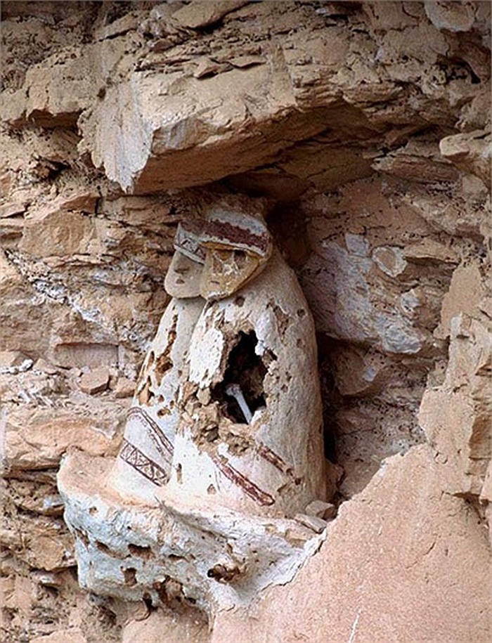 | Có lẽ chính nhờ được mai táng tại một địa điểm kín đáo và hiểm trở như vậy mà những chiếc quách này không phải chung số phận bị người Inca phá hủy như nơi khác. |