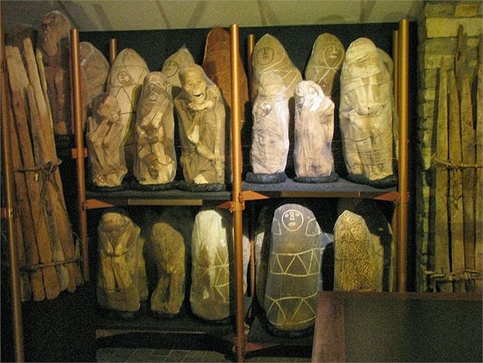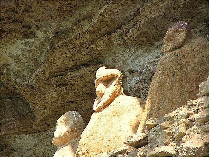 | Một số bức tượng còn được trang trí với các họa tiết miêu tả chiếc áo dài có gắn lông chim. Điều đó cho thấy người được táng bên trong là nam giới và rất có thể là người có địa vị quan trọng trong bộ lạc. |