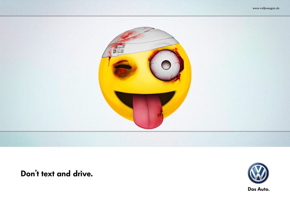 | "Đừng nhắn tin khi lái xe" - biểu tượng (icon) mặt cười quen thuộc trong các tin nhắn được Volkswagen sử dụng rất thông minh. |