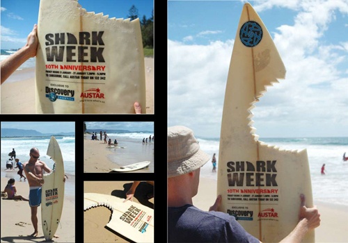 | Tại Úc năm 2007, kênh Discovery Channel đã đặt những tấm ván này bên bờ biển nhằm quảng bá cho loạt chương trình "Tuần cá mập". |