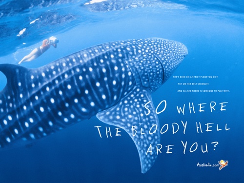 | Không có cá mập trong bức ảnh này, song nó được nhắc đến rất rõ ràng qua thông điệp: "Kẻ khát máu nhà ngươi đang ở đâu vậy". Đây là chiến dịch quảng cáo cho dịch vụ du lịch ở Úc. |