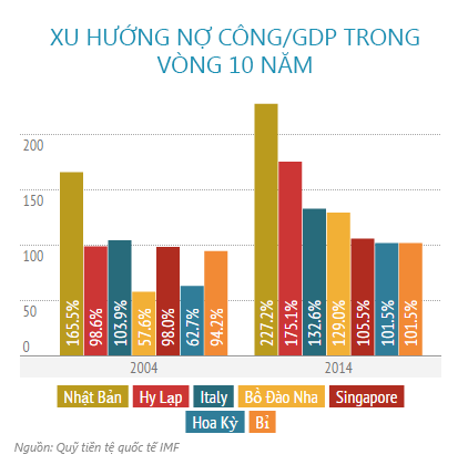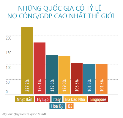 Không mấy ngạc nhiên khi Nhật Bản đứng đầu danh sách này với tỷ lệ Nợ công/GDP là hơn 227%. Theo sau là Hy Lạp (175%), Italy (133%). Mỹ đứng thứ 6 trong danh sách với số Nợ công bằng 101,5% GDP.