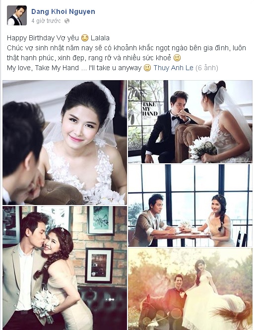 | Nhân dịp sinh nhật bà xã vào tháng 7/2014, Đăng Khôi viết trên trang cá nhân: "Happy Birthday vợ yêu. Chúc vợ sinh nhật năm nay sẽ có khoảnh khắc ngọt ngào bên gia đình, luôn thật hạnh phúc, xinh đẹp, rạng rỡ và nhiều sức khoẻ. My love, take my hand ... I'll take you anyway". |