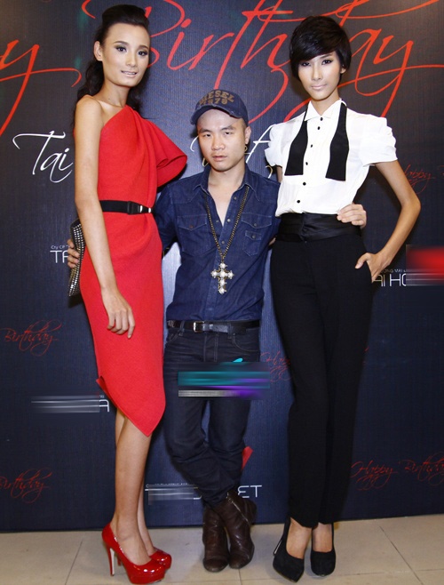 | Đỗ Mạnh Cường lọt thỏm bên hai người mẫu Lê Thúy và Hoàng Thùy. |