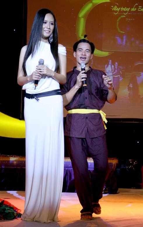 | Với chiều cao 1,79m lúc mới đăng quang, Mai Phương Thúy trông giống người khổng lồ khi đứng cạnh nam ca sĩ Quang Linh. |