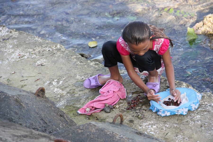 Nguyễn Thị Tình cho biết em đang học lớp 6, ngày hè không đi học thêm mà ra biển bắt cá, ốc để phụ giúp cha mẹ.