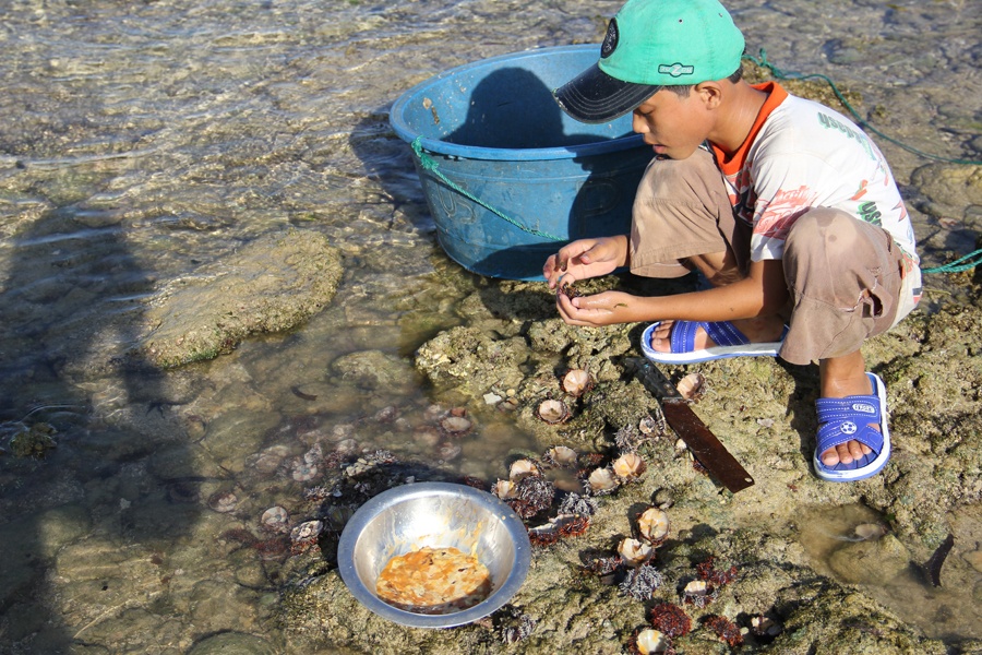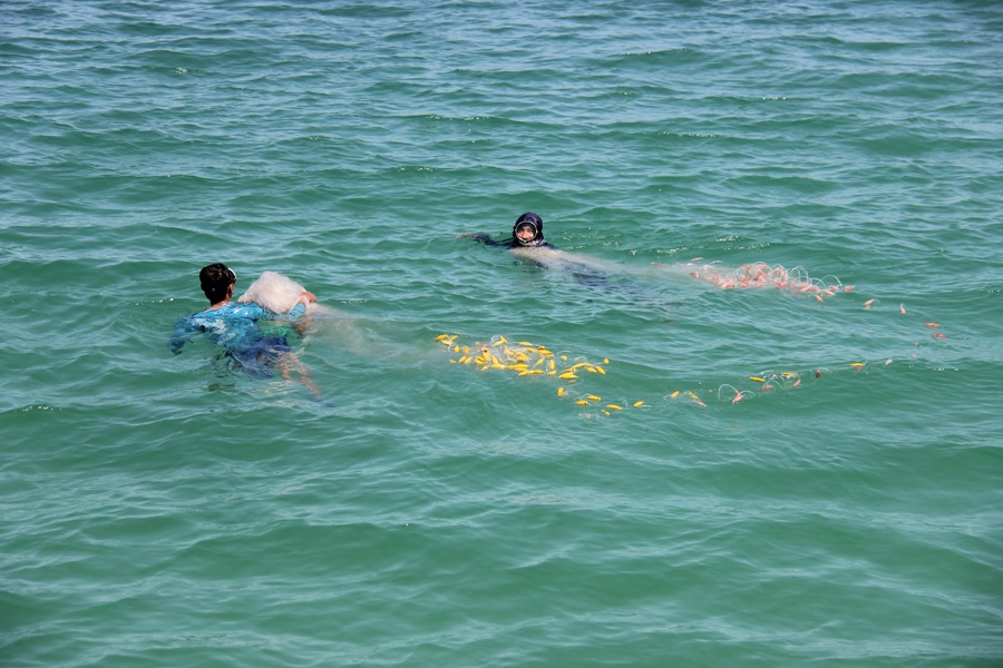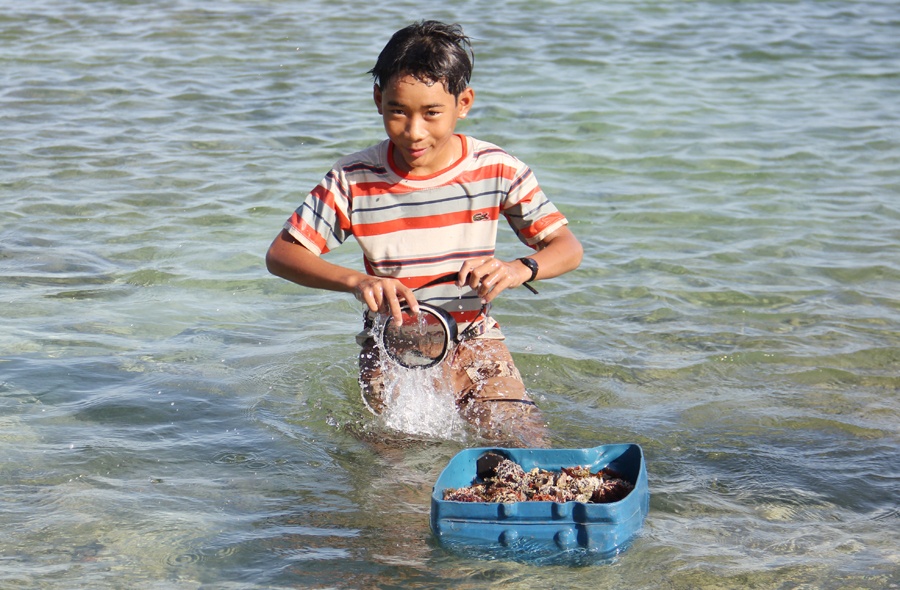 | Các bé gái cũng tỏ ra không kém bé trai trong việc bơi lặn săn tìm hải sản ở vùng biển ven bờ. |