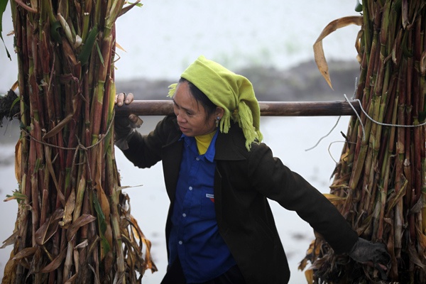 Thời tiết rét đậm, nhiệt độ thường xuyên dao động trên dưới 5 độ C, vì vậy những phụ nữ nơi đây phải luôn chuẩn bị khăn áo ấm chống rét.