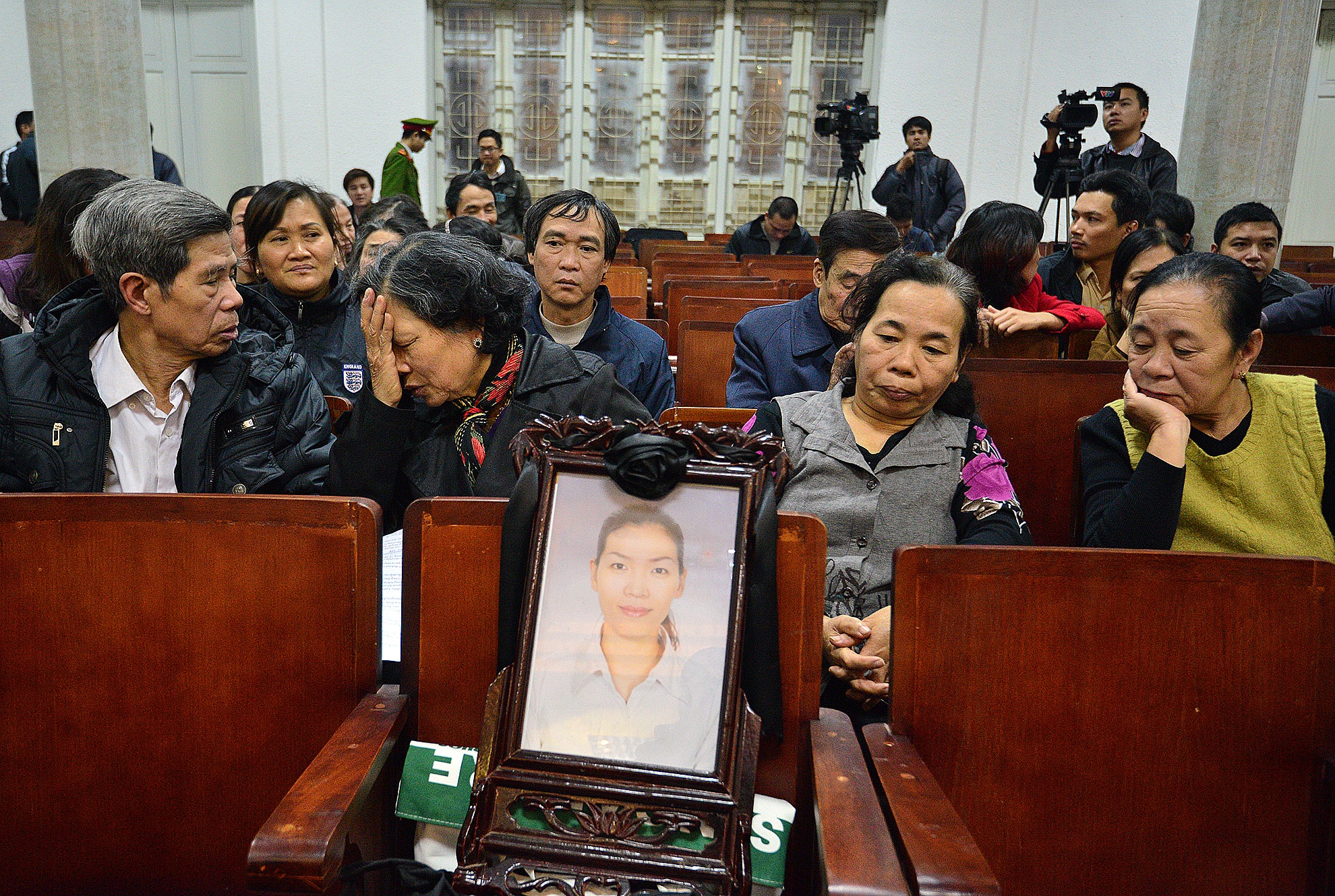 | Người nhà chị Lê Thị Thanh Huyền mang di ảnh nạn nhân vào tòa. Vụ án xảy ra đã lâu nhưng nỗi đau mất con khiến bà Hiền (mẹ nạn nhân) khó kìm nén cảm xúc. |