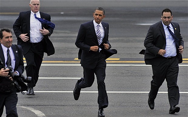| Mật vụ chạy theo ông Obama. Họ sẵn sàng dùng thân mình để che chắn cho ông chủ Nhà Trắng. Ảnh: AFP |