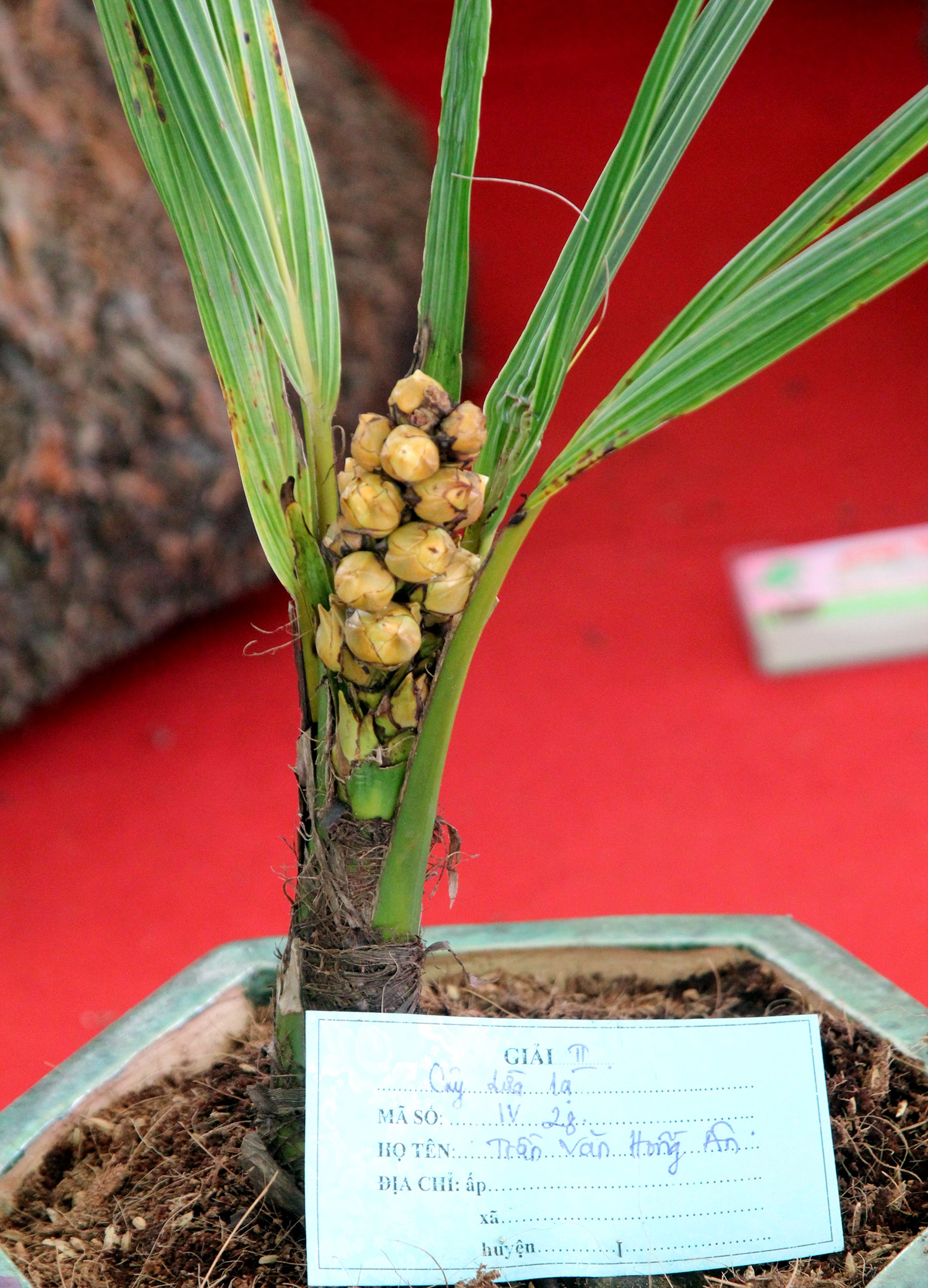 | Một cây dừa lạ cao 20 cm đã ra hoa, kết quả. |