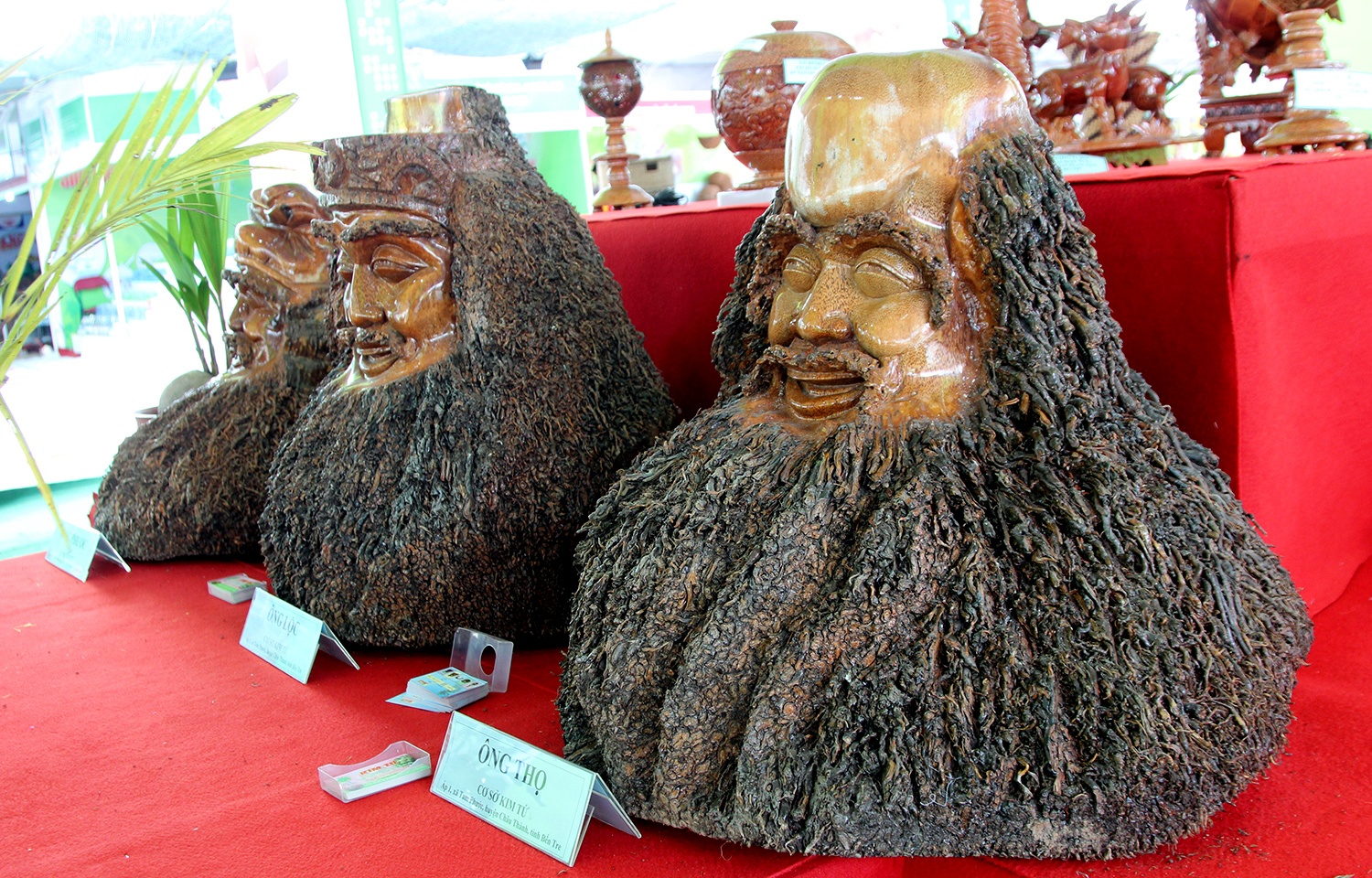 | Ấn tượng nhất hội chợ năm nay là bộ ba "Phúc - Lộc - Thọ" được điêu khắc từ rễ dừa. Ông Hồ Kim Tứ, người làm ra bộ sản phẩm này cho biết, gốc dừa được sấy khô trước khi giao cho thợ điêu khắc. Các nghệ nhân mất khoảng 1 tháng mới hoàn thành bộ sản phẩm có giá bán 30 triệu đồng. |