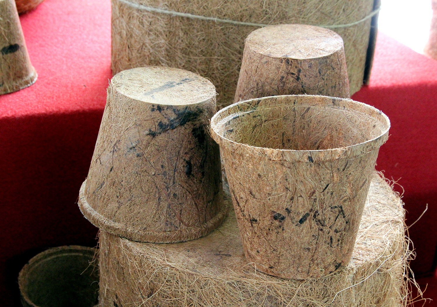 | Xơ dừa được ép thành những chiếc chậu trồng hoa xinh xắn. |