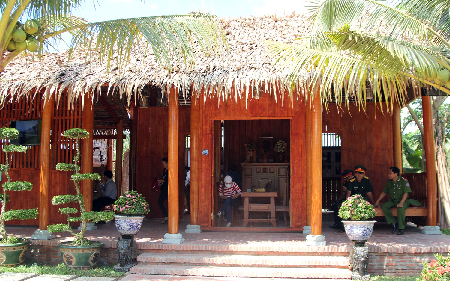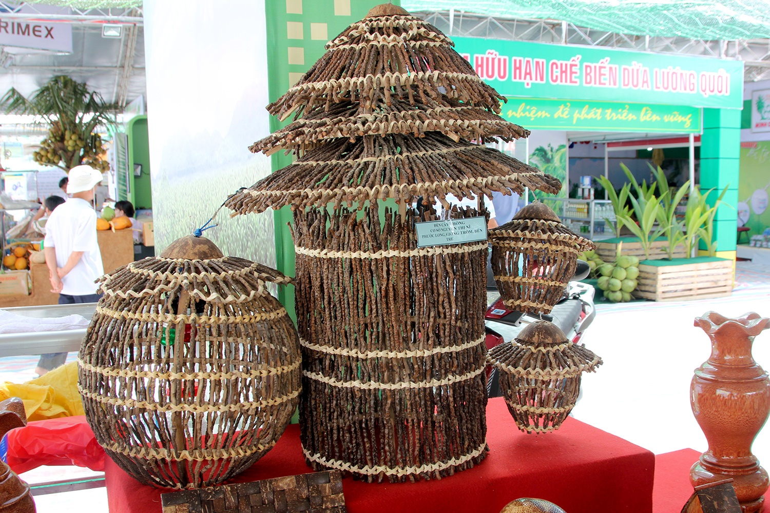 | Trong hội chợ cũng trưng bày một ngôi nhà ba gian được làm hoàn toàn bằng dừa. Đây là dạng nhà tiêu biểu của người dân Bến Tre ở giai đoạn sản xuất nông nghiệp chuyển qua nghề trồng dừa. |