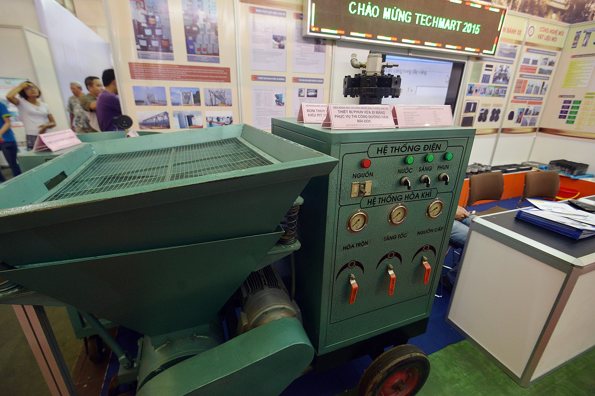Thiết bị phun vữa xi măng (trái) phục vụ thi công đường hầm mái dốc và bơm thủy lực siêu cao áp kiểu pít tông hướng kính (phải) của Viện khoa học công nghệ Giao thông vận tải.