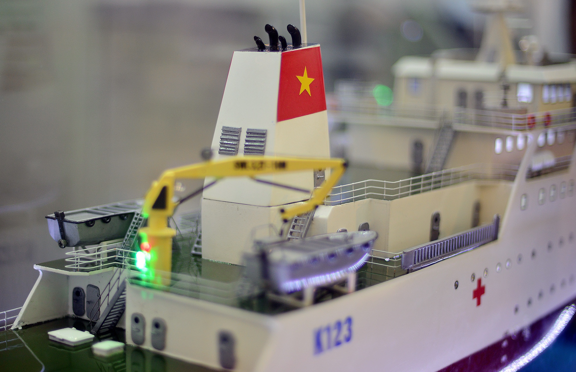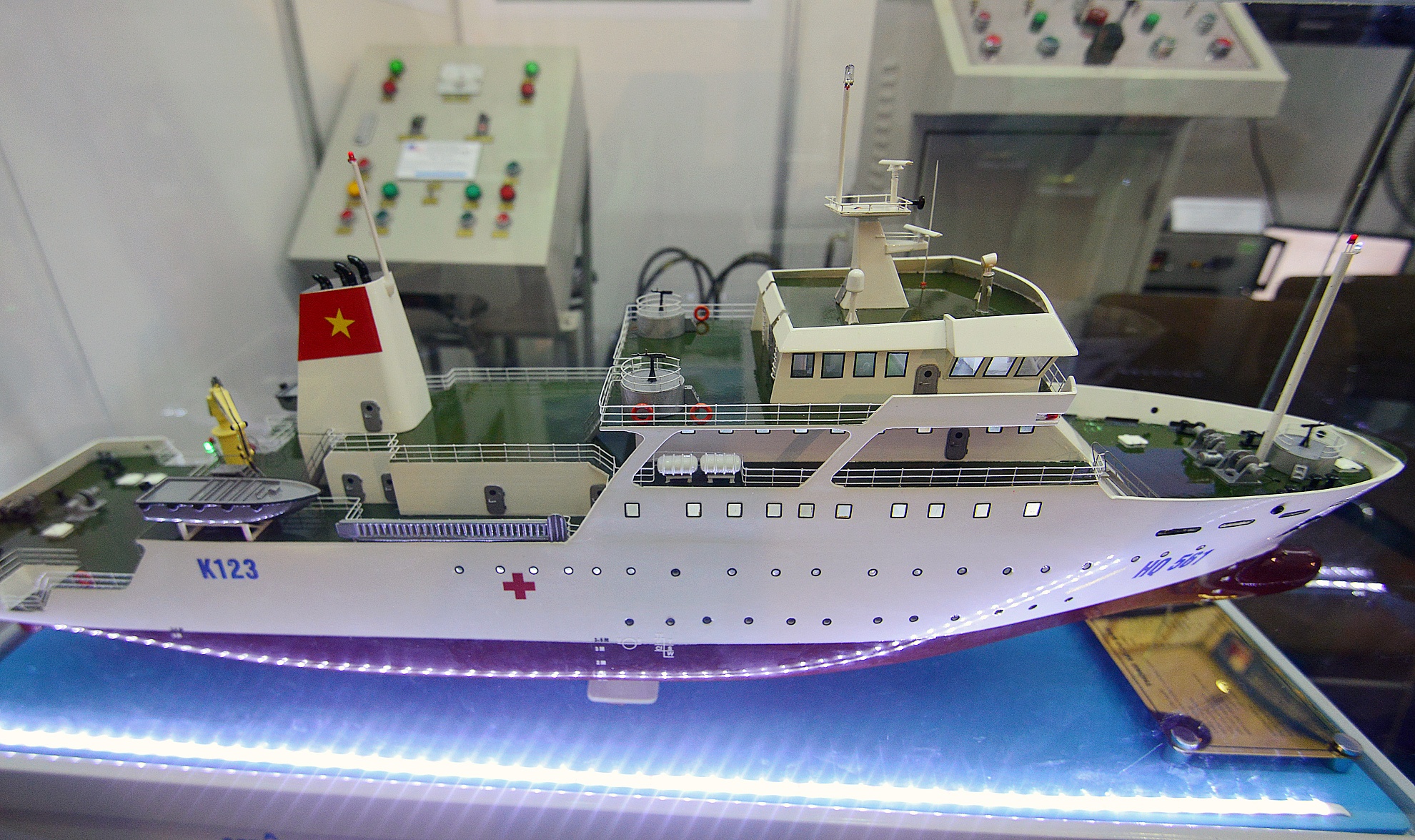 Các thiết bị mô hình thay thế cho những sản phẩm có kích thước lớn đưa ra triển lãm thu hút khách hàng không kém đồ thật tại hội chợ. Trong ảnh là một trong những sản phẩm được người Việt Nam sản xuất: mô hình tàu quân y K123 (HQ 561), là một bệnh viện trên biển, chuyên phục vụ khám chữa bệnh cho quân dân quần đảo Trường Sa. Sản phẩm do Viện Khoa học công nghệ tàu thủy đóng mới.