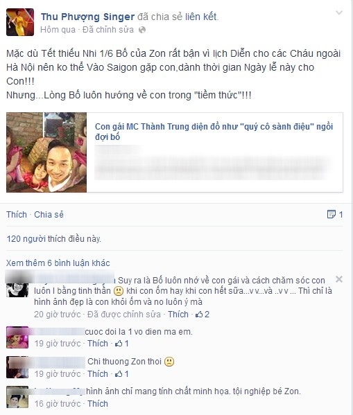 | Đầu tháng 6/2014, diễn viên hài kiêm MC Thành Trung cũng bị vợ cũ – ca sĩ Thu Phượng mỉa mai giả tạo về tình cảm cha con. Sự việc bắt nguồn từ hôm 31/5, Thành Trung đăng ảnh thân thiết của anh và con gái Zon (tên thân mật của con gái chung). Tuy nhiên theo lời Thu Phượng, ngày 1/6 chồng cũ bận diễn ở Hà Nội nên không thể bên cạnh con gái đang ở Sài Gòn. |