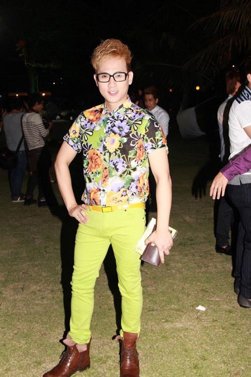 Nguyên Vũ quá điệu khi chọn màu vàng và hoa lá cành lòe loẹt trên người.